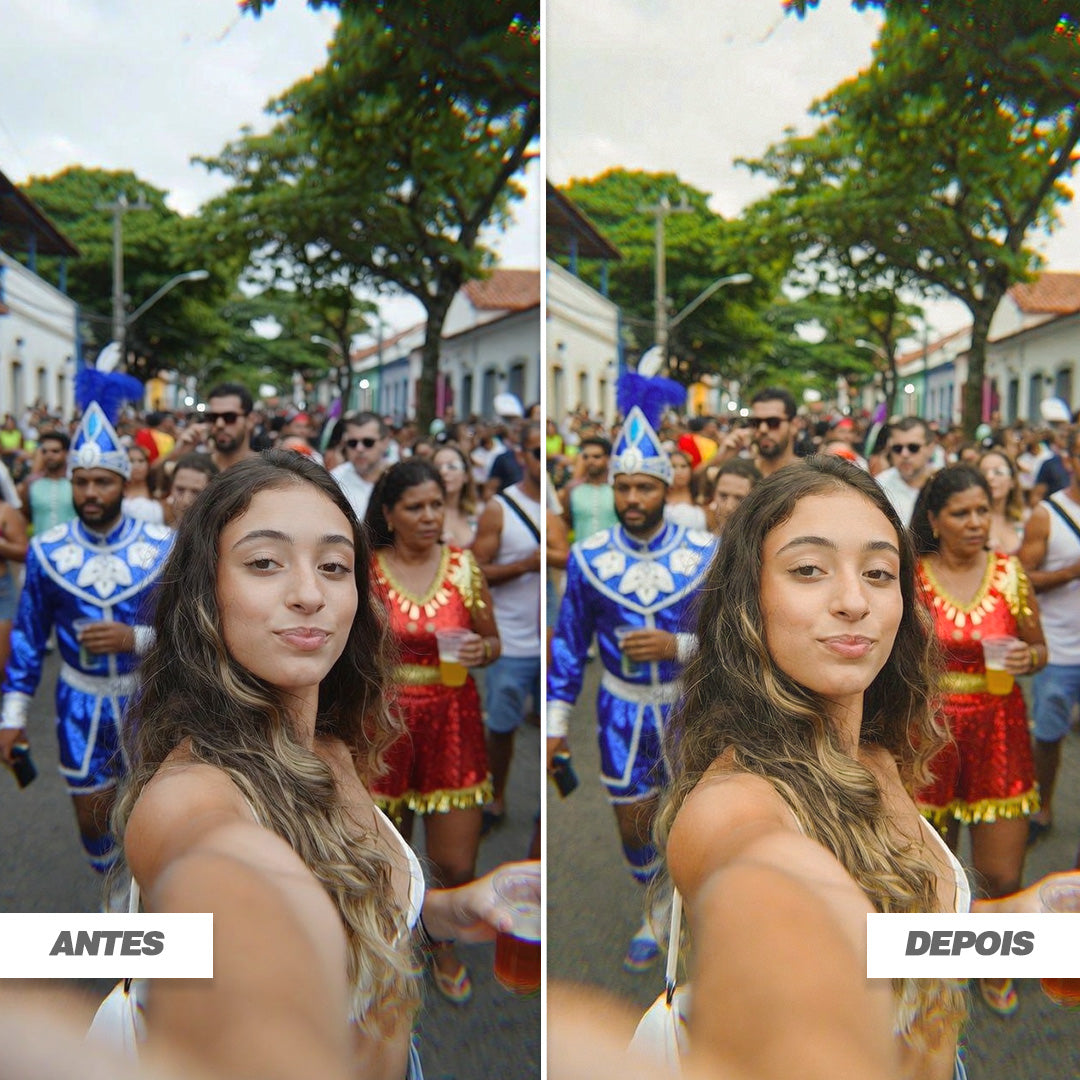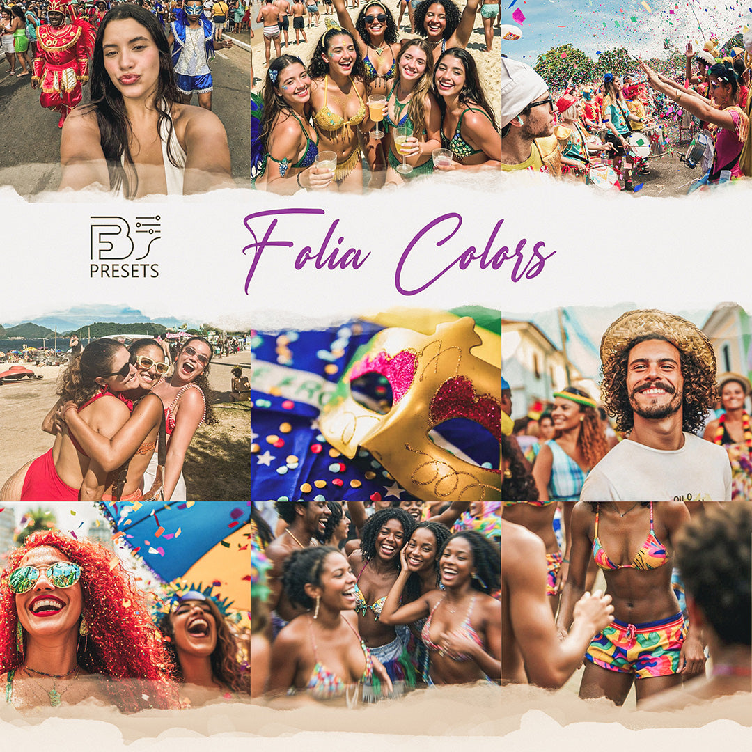 Presets desenvolvidos para harmonizar a explosão de cores do Carnaval com uma estética tropical e rústica. O pack Folia Colors realça o bronzeado, e traz tons dourados e coloridos, perfeitos para a luz natural. Ideal para fotos de bloquinhos, looks de verão e para registrar a energia vibrante das festas.